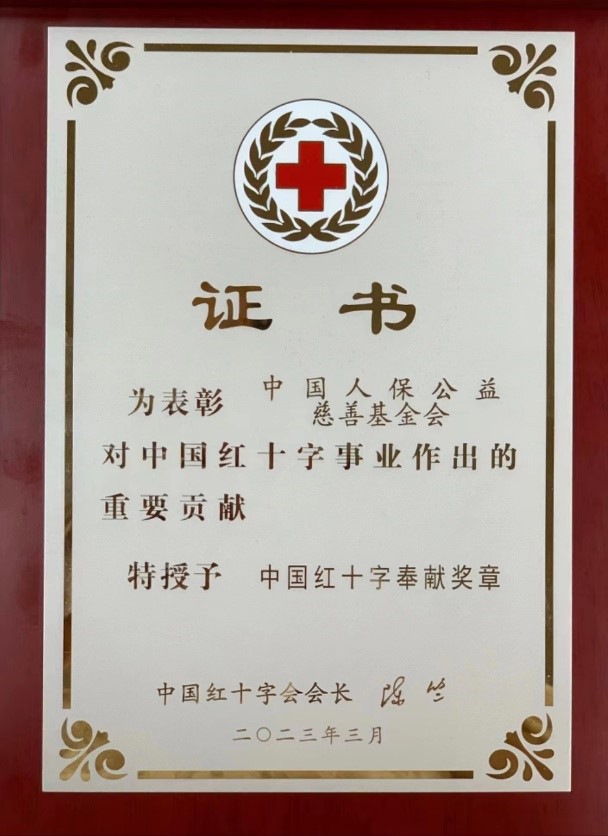 5月7日,为表彰对中国红十字事业作出的重要贡献,中国红十字会总会向中国人保公益慈善基金会颁发了“中国红十字奉献奖章”。