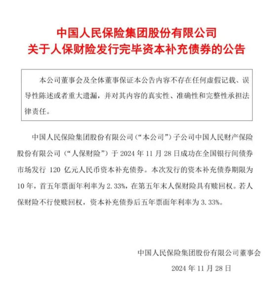 近日,中国人民保险集团股份有限公司发布公告,该集团子公司中国人民财产保险股份有限公司(以下简称“人保财险”)于2024年11月28日成功在全国银行间债券市场发行120亿元资本补充债券。