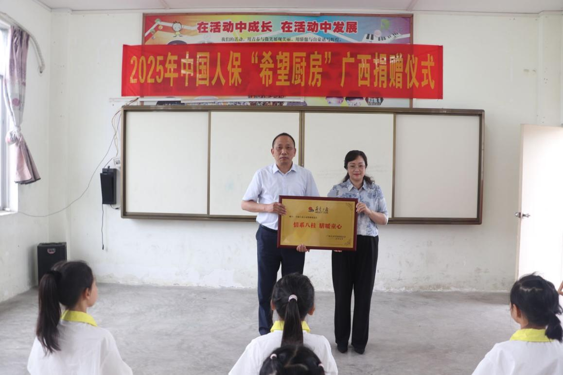随后,中国人保公益慈善基金会向中国青少年发展基金会、广西青少年发展基金会递交捐赠牌。广西希望工程办公室主任、广西青少年发展基金会理事长蒋慧恒回赠荣誉牌匾,表达感谢。中国青少年发展基金会党委常委、副秘书长李虹遐指出,期待希望厨房项目能为越来越多乡村孩子带来实实在在的改变,成长为有理想、有本领、有担当的栋梁之才,今后将持续着力打造好新时代希望工程——这一服务大局的民心工程。