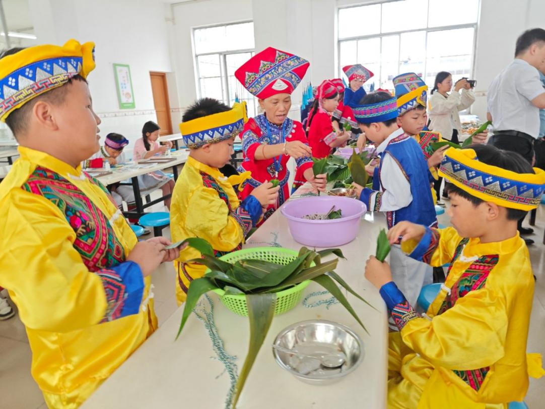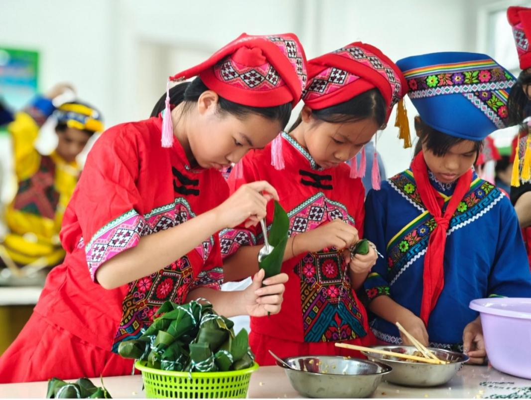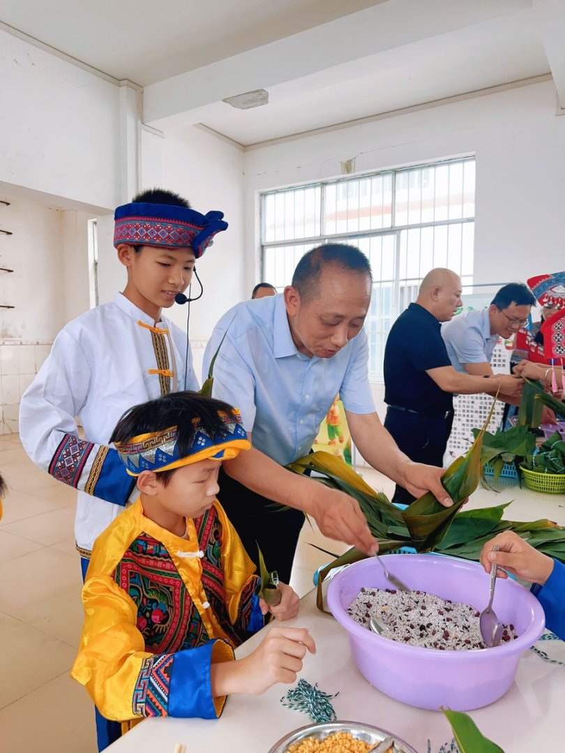 捐赠仪式结束后,学校食堂变成了最热闹的角落。孩子们和嘉宾一起包粽子,做广西特色美食“水果酸嘢”,糯米、芒果等食材铺满台面,香气与笑声交织,汇成一幅热气腾腾、暖意融融的画面。