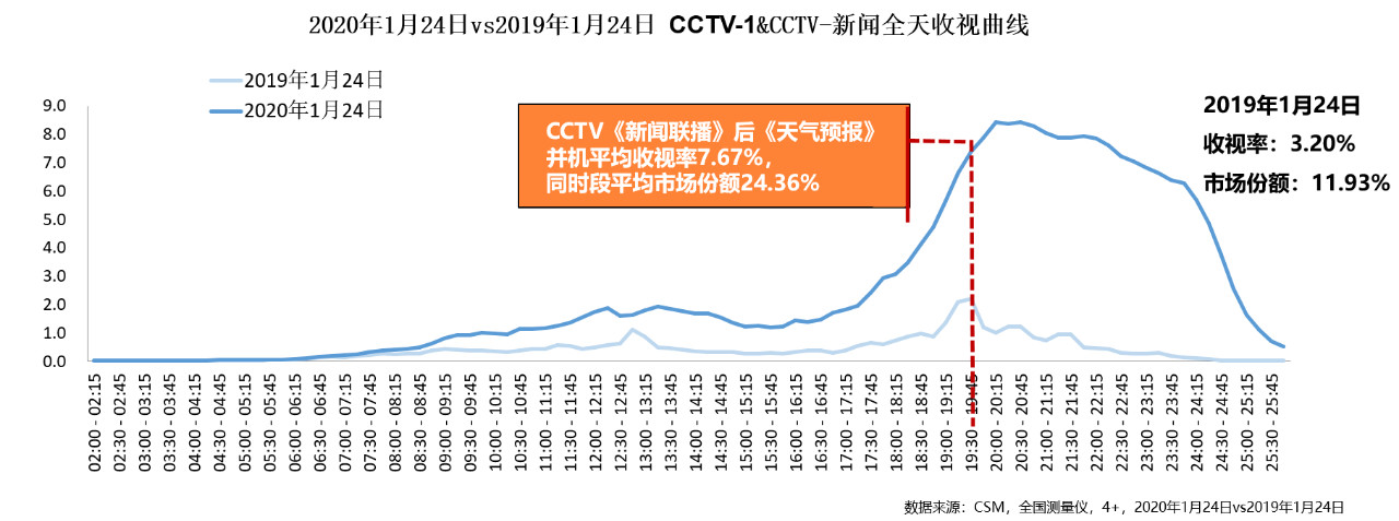在此期间,在CCTV-1及CCTV-新闻频道并机播出、连续10年位列同时段所有频道之首的CCTV《新闻联播》后《天气预报》受到公众高度关注,1月24日,节目收视率达7.67%,市场份额达24.36%,较去年同期分别增长140%、104%。